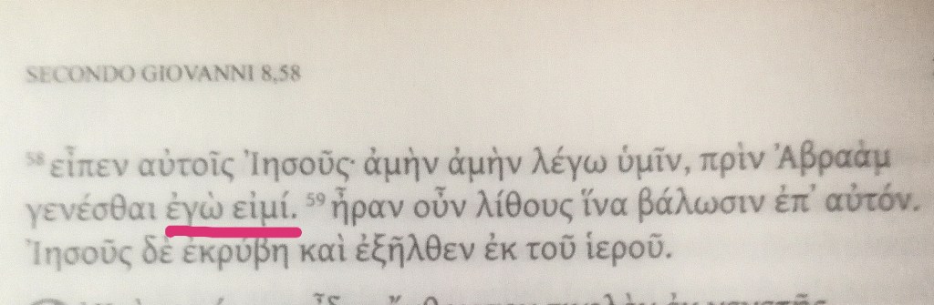 Nella foto n. 1: il testo greco di Giovanni 8,58: ἐγὼ εἰμί (egō eimì)