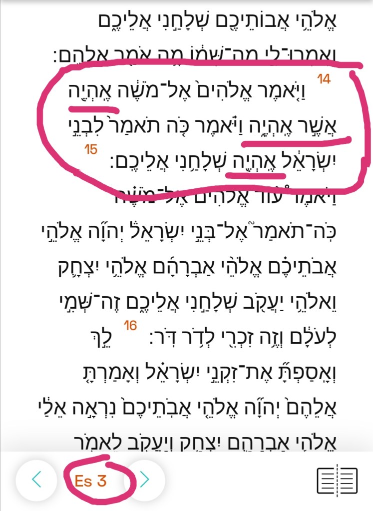 Nella foto n. 2: il testo ebraico masoretico di Esodo 3,14: אֶֽהְיֶ֖ה אֲשֶׁ֣ר אֶֽהְיֶ֑ה (ehyeh ʾašer ʾehyeh) e: אֶֽהְיֶ֑ה (ehyeh) / L’ebraico si legge da destra verso sinistra