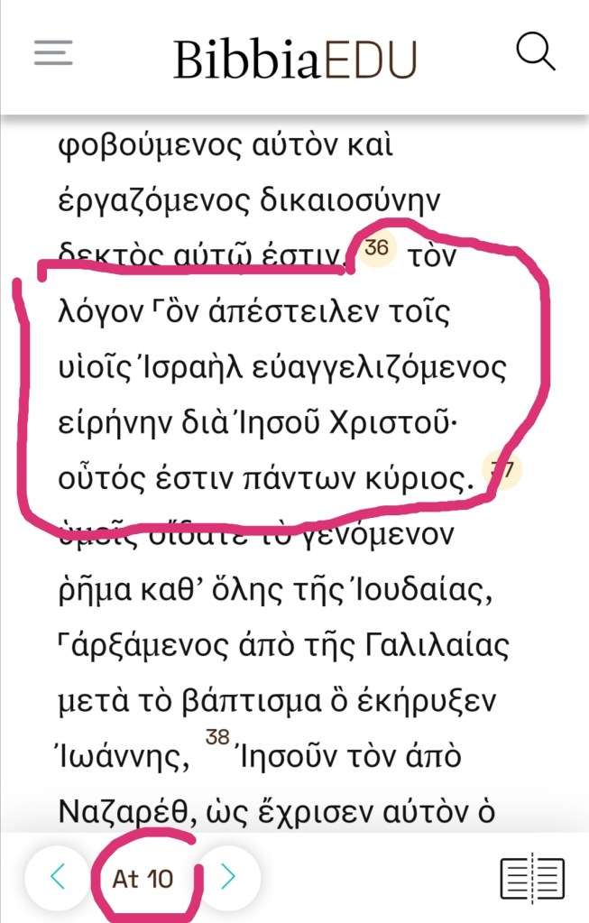 Nella foto il testo greco di Atti 10,36
